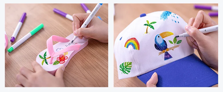 | New Sublimation Markers & Direct-on-Fabric Markers Let your imagination run wild! You can choose our sublimation markers, draw your design on copy paper then transfer it on your item. You can also try our direct-on-fabric marks. No need for any heat press machine, you can directly create your free style design on t-shirts, shoes, bags, hats, etc. Both the sublimation markers and fabric markers can be applied on any fabric and make your items colorful and bright forever! |