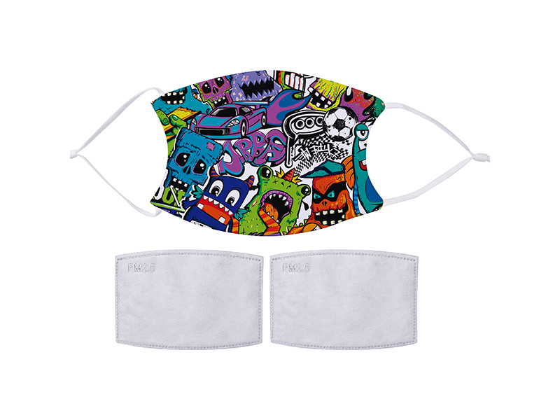 Material: 100% poliéster para sublimação. Cada máscara vem com dois filtros PM2.5 que se colocam dentro da máscara para maior proteção. O gancho da orelha é ajustável.